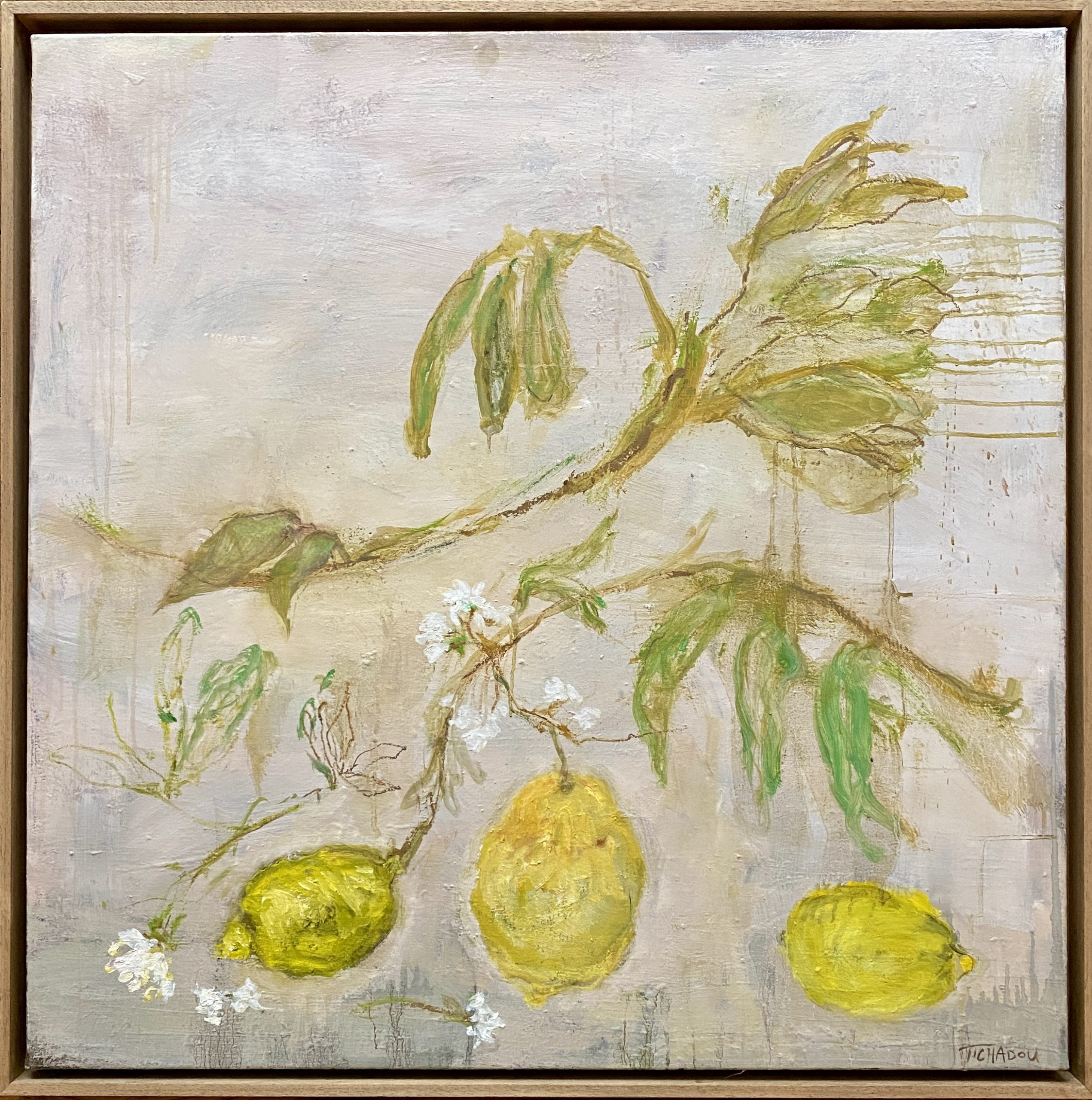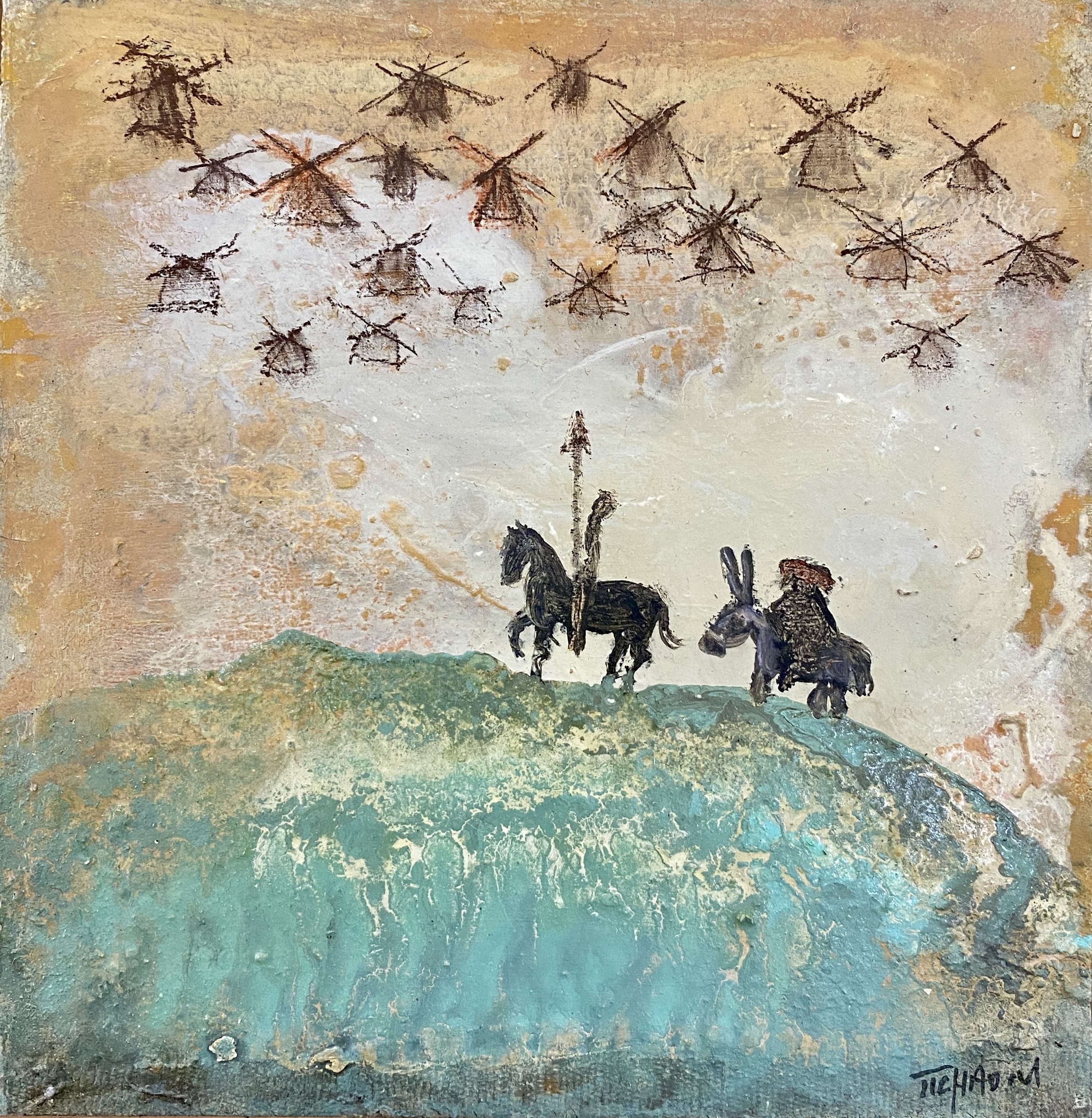 Dans cette nouvelle exposition, Corinne Tichadou poursuit un voyage imaginaire dans des terres plus exotiques que jamais, peuplées de ses nouveaux motifs fétiches : cactus – comme dans l’oeuvre à l’affiche – palmiers, citrons, singes ou éléphants. Mais ces escapades aux saveurs d’Orient ne sont que des pas de côté provisoires car les motifs fondamentaux de l’artiste ne sont jamais loin. Si elle n’en finit pas d’explorer et de prolonger le roman visuel de Don Quichotte, elle nous invite aussi dans un abondant potager, près du verger de ses rêves, où elle prête sa touche alerte et sensuelle aux radis, fleurs d’artichauts et grenades. Une peinture gorgée de poésie dont l’aspect confère parfois à la fresque et qui dans sa foisonnante diversité nous chuchote toujours : c’est la vie.